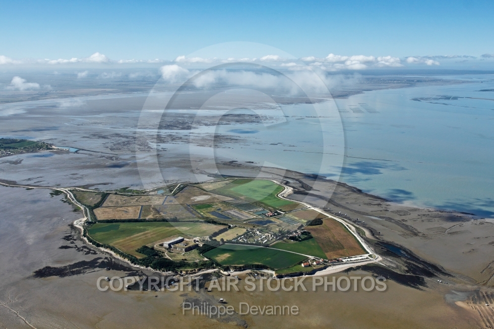 Description: Photographie aérienne de l île Madame avec ciel bleu et nuages à 1500 pieds d altitude, commune de Port-les-Barques, 17730, département de la Charente-Maritime 17, Région Poitou-charentes, France, Europe