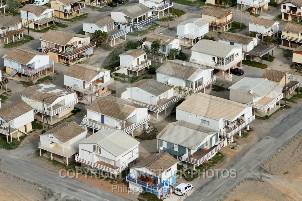 Description: Vue aérienne des chalets sur pilotis de Guissan plage 11430, Aude, Languedoc-Roussillon, France