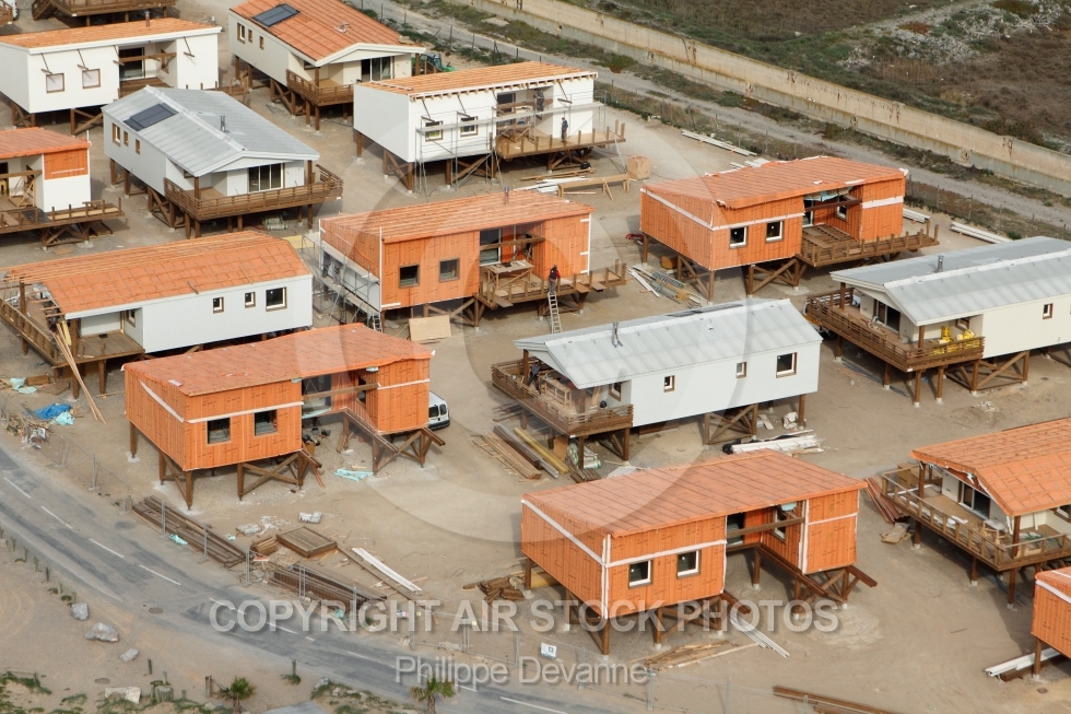 Construction de chalets sur pilotis à Gruissan-Plage 11430, Aude, Languedoc-Rousillon, France