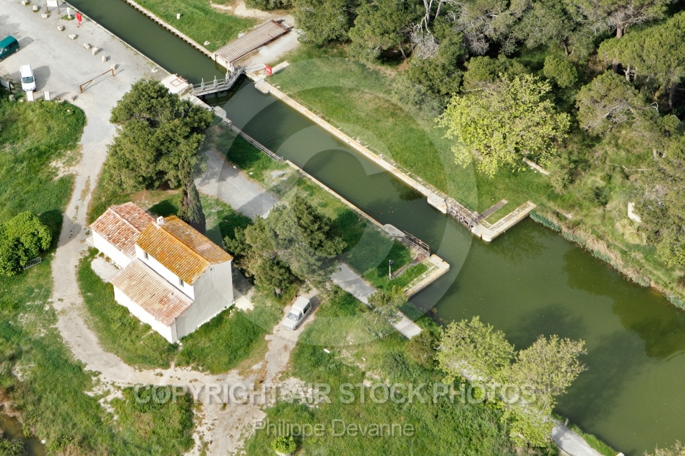 Description: Photo aérienne de l écluse de Sainte Lucie, canal de la Robine, Commune de Port-la-Nouvelle 11210, Aude, Languedoc-Roussillon, France