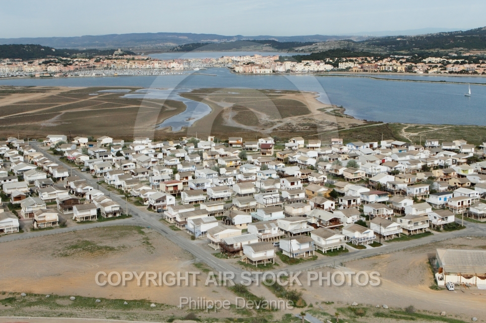 Description: Vue aérienne des chalets sur pilotis de Guissan plage 11430, Aude, Languedoc-Roussillon, France