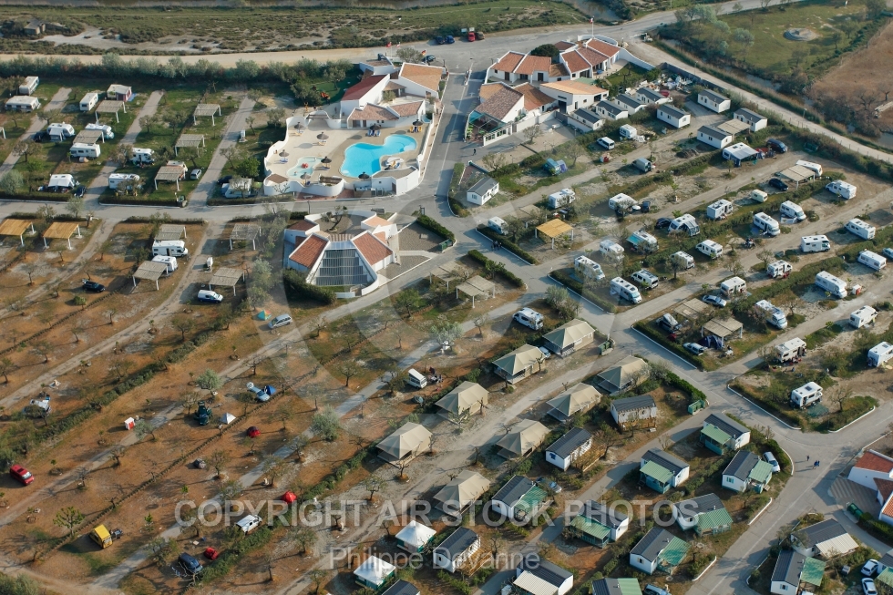 photo aerienne saintes maries de la mer camping mobil-home tente vacances camargue bouches du rhone paca photo aérienne ville mer provence aérien paysage méditerranée provence-alpes-côte d'azur vue d'en haut vue du ciel 13 13096 france europe