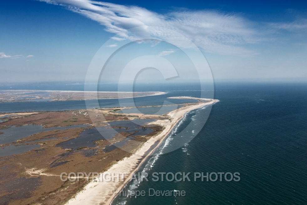 Photo aérienne de l Embouchure du Rhône , vue la commune d Arles 13129 , de la plge de Piémanson en Camargue vers Port-Saint-Louis-du-Rhône , Département des Bouches du Rhone, Région P.A.C.A, Provence Alpes-Côte d Azur, France, Europe