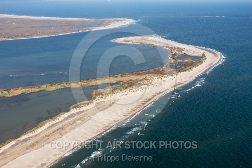 Photo aérienne de l Embouchure du Rhône , vue la commune d Arles 13129 , de la plge de Piémanson en Camargue vers Port-Saint-Louis-du-Rhône , Département des Bouches du Rhone, Région P.A.C.A, Provence Alpes-Côte d Azur, France, Europe