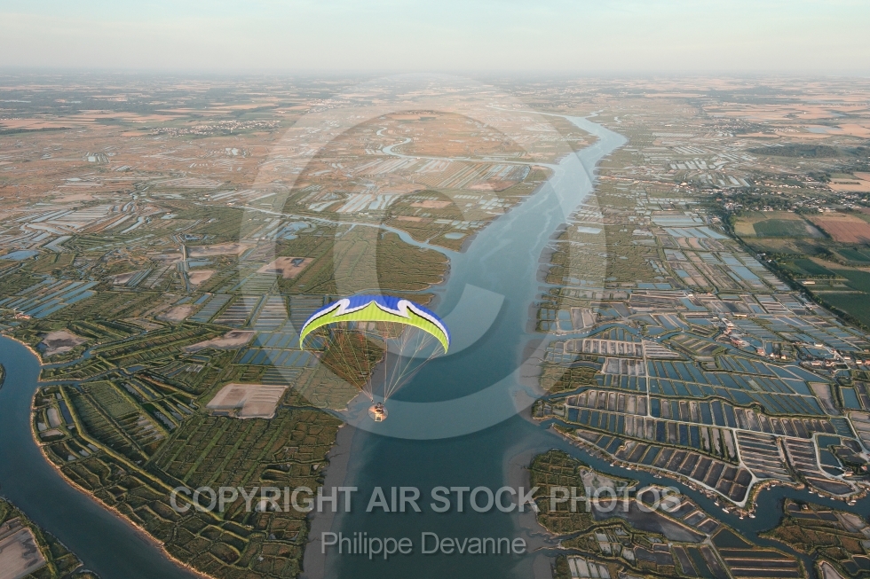 Description: Photographie aérienne d un paramoteur en vol au dessus de la Seudre , sur la commune de La Tremblade 17390 , département de la Charente-Maritime région Aquitaine-Limousin-Poitou-Charente, France. Prise de vue du 25 juin 2015