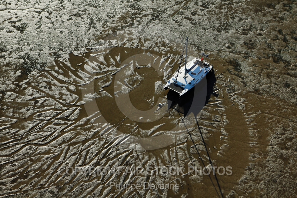 Description: Photographie aérienne d un voilier a marée basse au milieu de l Anse de la Palmyre, commune Les Mathes 17570 , département de la Charente-Maritime région Aquitaine-Limousin-Poitou-Charente, France. Prise de vue du