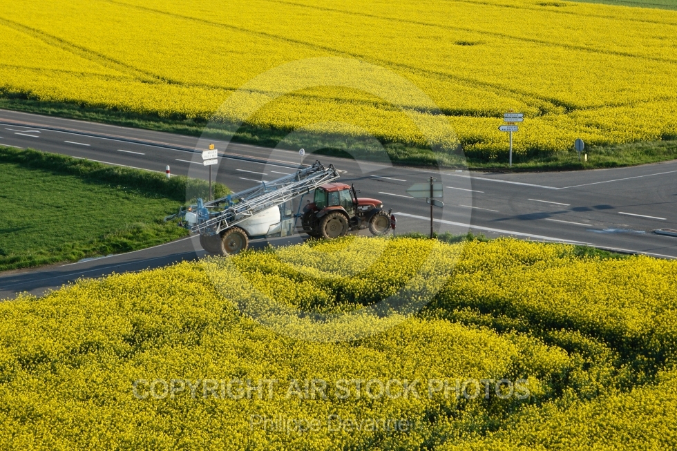 Description: Epandage pesticide , Culture du colza en Eure-et-Loir photo aérienne d un champ de colza et d un tracteur