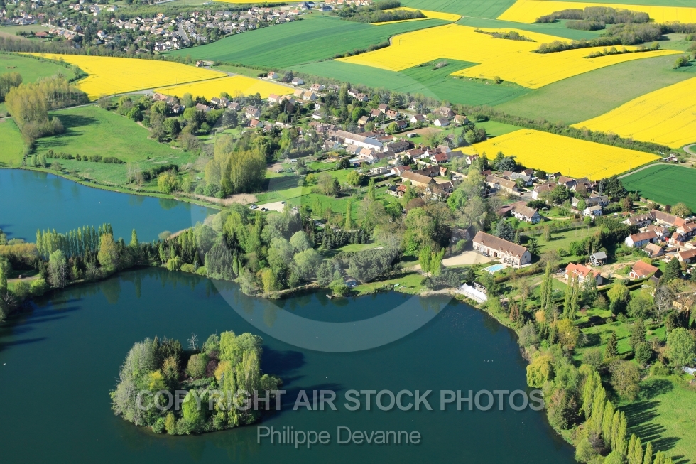 Description: Etangs de Chandelles et champs de colza en fleur vu du ciel au printemps, 28210 Coulombs, département d Eure-Et-Loire, région Centre, France