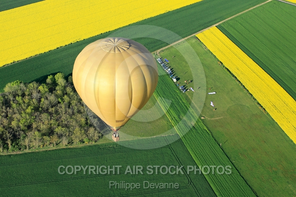 Description: Vue aérienne en ULM du survol des champs de colza en Montgolfière. Maintenon 28130, Département d Eure-et-Loire, Région Centre, France