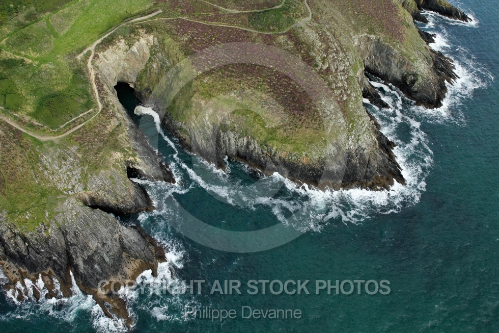 Photo aérienne des falaises et grottes de Ty Mark, commune de Plomodiern 29550, Pors ar Varg, situé à 1km à l ouest des falaises de Kervigen et au sud de la Pointe de Tal Ar Grip et des plages de Pentrez-Lestrevet, département du Finistère 29, La Bretagne vue du ciel, France Ouest, Europe. Juillet 2012