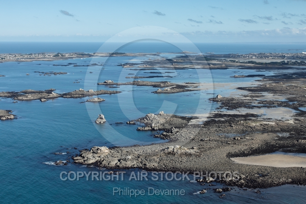 Vue aérienne du littoral de Santec , côtes du Finistère 29250, région Bretagne, arrondissement de Morlaix, Communauté de communes du Pays Léonard, France , Europe