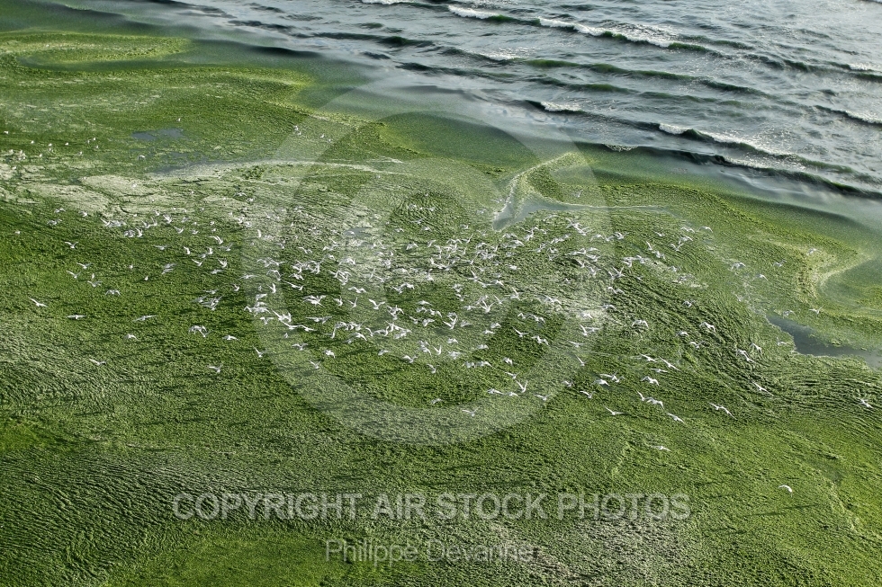 Photo aérienne de la prolifération des algues vertes ou laitue de mer à Lestrevet dans la Baie de Douarnenez début juillet 2012 , commune de 29550 Plomodiern, département du Finistère 29, La Bretagne vue du ciel, France Ouest, Europe