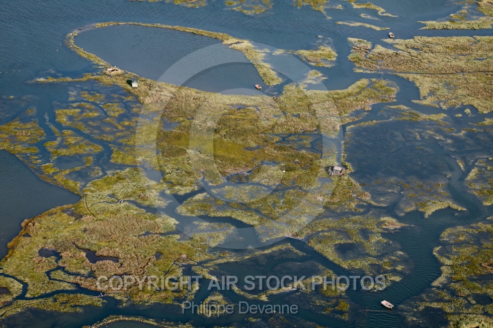 Description: Photographie aérienne des tonnes ou cabanes pour de chasse dans les prés salés de la hume à Gujan-Mestra 33470, commune du Bassin d Arcahon, département de la Gironde, région Aquitaine, France - Juillet 2015