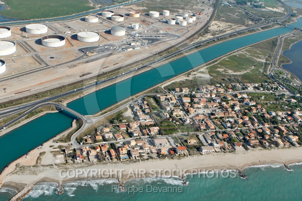 photograhie aérienne du bacs de dépôt d hydrocarbures de Frontignan , Hérault 34, Languedoc-Roussillon, France