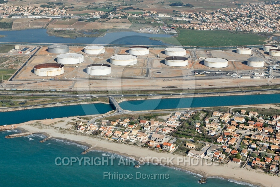 photograhie aérienne du bacs de dépôt de pétrole et d hydrocarbures de Frontignan 34110 , Hérault 34, Languedoc-Roussillon, France