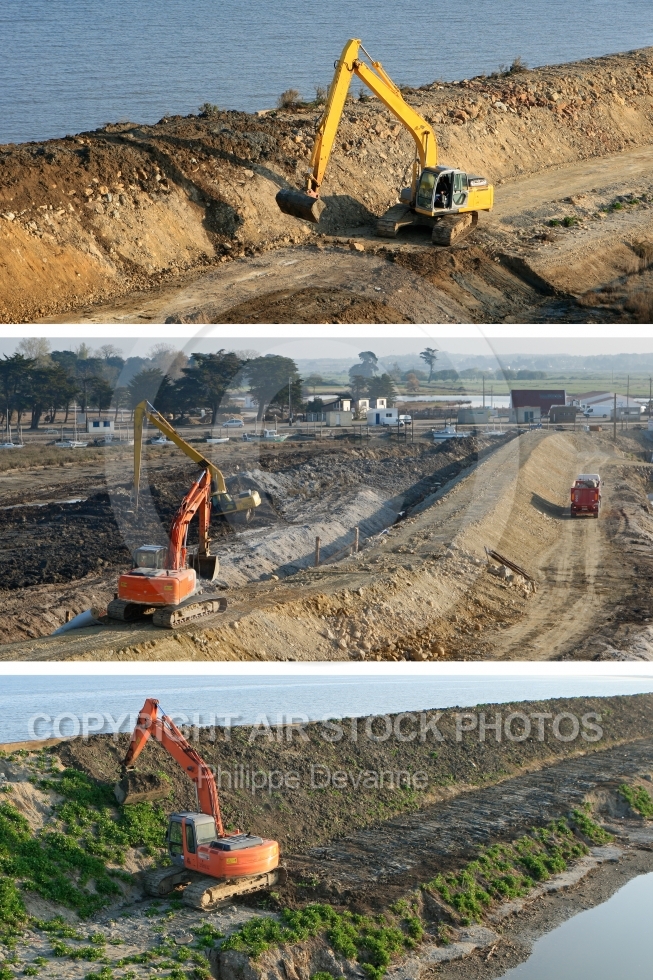 vue aérienne xynthia reconstruction construire digues tempete pelleteuse travaux chantier menace montée des eaux protection proteger renover innondations catastrophe vendée vu du ciel survol ville côte plage atlantique aérien voyage France mer