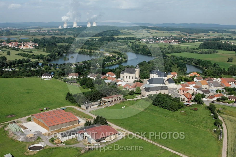 Description: Photo aerienne de Berg-sur-Moselle 57570, centrale nucléaire de Cattenon en arriere plan, arrondissement de Thionville.la Moselle 57 vue du ciel en ULM paramoteur, en région Lorraine, France, Europe