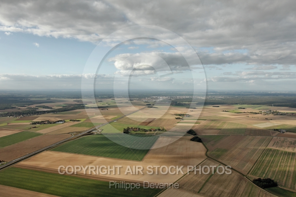 Vue aérienne champs et nuages à 800 m avec la ville de Rambouillet en arriere plan, sonchamp 78120, Yvelines, région Ile-de-France