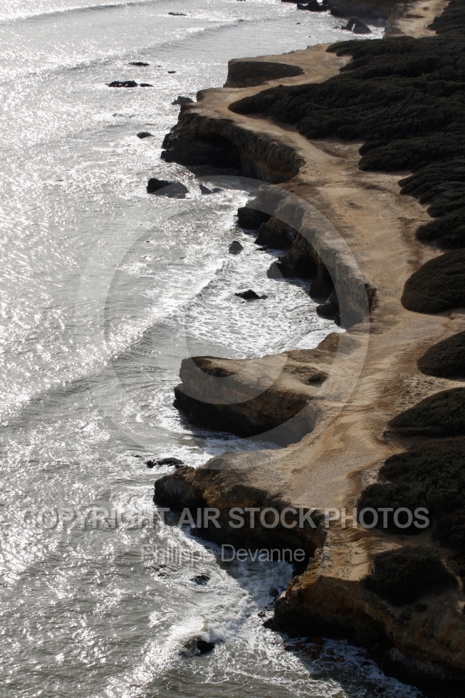 vue aérienne falaise pointe du Payré contre-jour plage littoral Le Rocher ville vendée vu du ciel survol ville côte atlantique aérien voyage France mer 85 Vendée Pays-de-Loire 85520