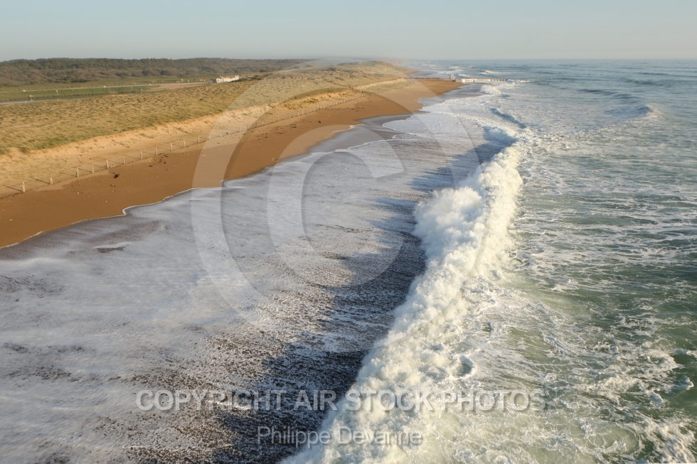 Description: Photographie aérienne de la mer agitée et la forte houle sur la côte sauvage de Brétignolles-sur-Mer 85470 pendant les hautes marées, situé à l ouest de la Vendée, en région Pays de la Loire, France. Prise de vue du 19 avril 2018