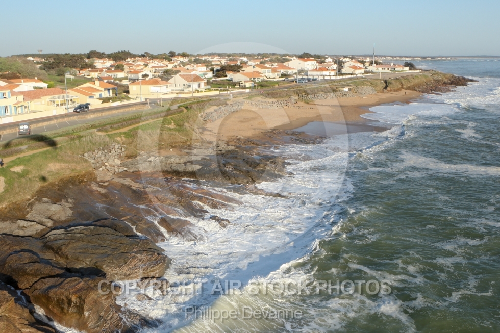 Description: Photographie aérienne de la mer agitée et la forte houle au spot de la Sauzaie, de Brétignolles-sur-Mer 85470 pendant les hautes marées, situé à l ouest de la Vendée, en région Pays de la Loire, France. Prise de vue du 19 avril 2018