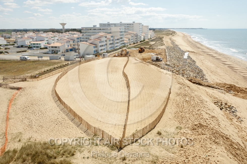 Description: Photo aérienne reconstruction et travaux de consolidation de la digue de la plage des Mouettes, les Marines à Saint-Hilaire-de-Riez 85270 , département de la Vendée région Pays de la Loire, France. Prise de vue du 21 avril 2016