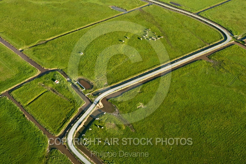 Description: Photographie aérienne du Marais Poitevin en Vendée 85 situé sur les commune de Angles, Grues et St-Michel-en-l Herm en région Pays de la Loire Atlantique, France. Prise de vue d avril 2017