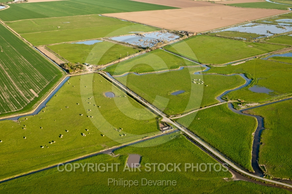 Description: Photographie aérienne du Marais Poitevin en Vendée 85 situé sur les commune de Angles, Grues et St-Michel-en-l Herm en région Pays de la Loire Atlantique, France. Prise de vue d avril 2017