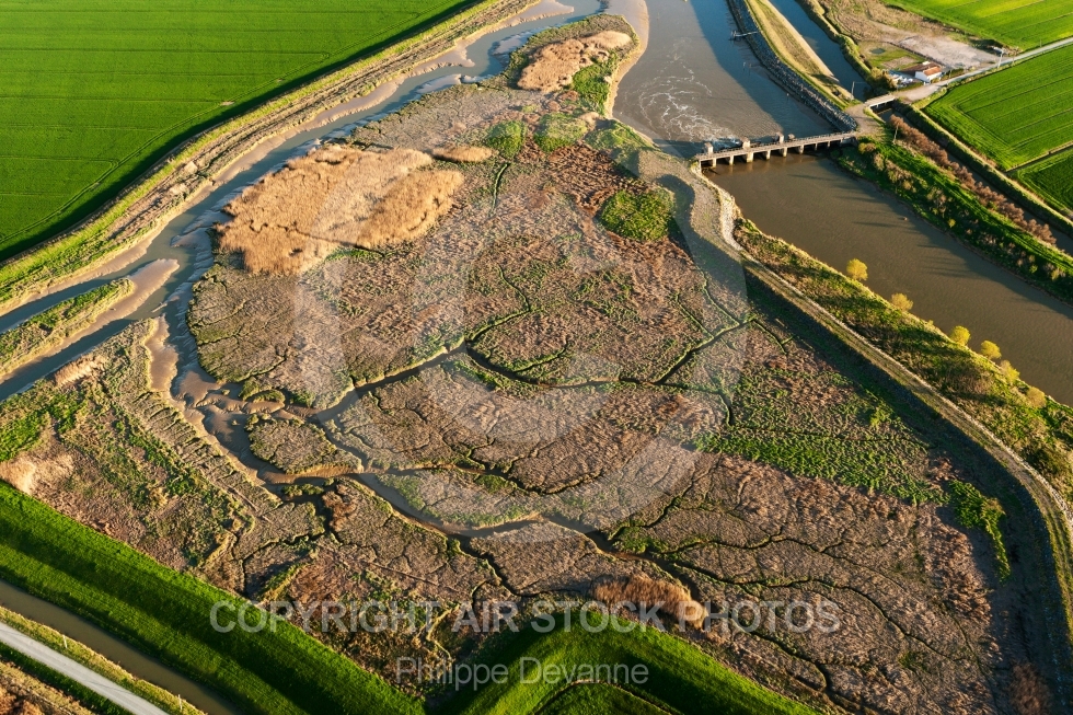 Photographie aérienne du Marais Poitevin en Vendée 85 situé sur les commune de Angles, Grues et St-Michel-en-l Herm en région Pays de la Loire Atlantique, France. Prise de vue avril 2017