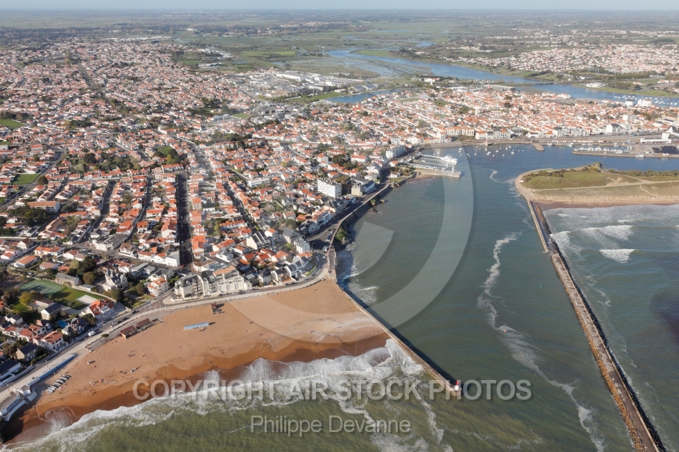 Description: Photographie aérienne du port de Saint-Gilles-Croix-de-Vie 85800 et Saint-Hilaire-de-Riez 85270 situé à l ouest de la Vendée, en région Pays de la Loire, France. Prise de vue du 17 avril 2018