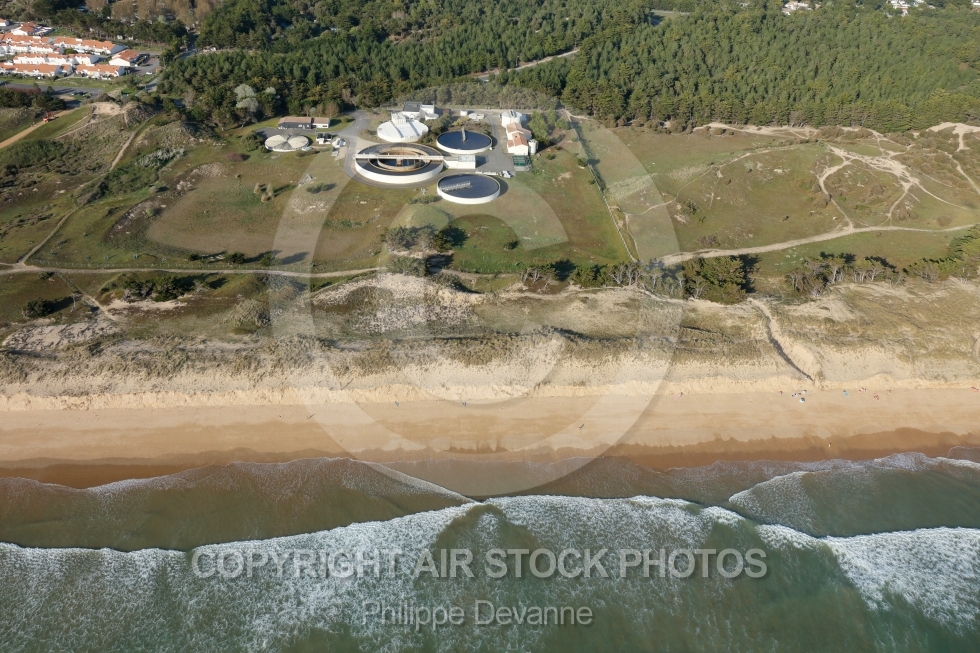 Description: Photographie aérienne du littoral de Saint-Hilaire-de-Riez situé à l ouest de la Vendée, en région Pays de la Loire, France. Prise de vue du 20 avril 2018