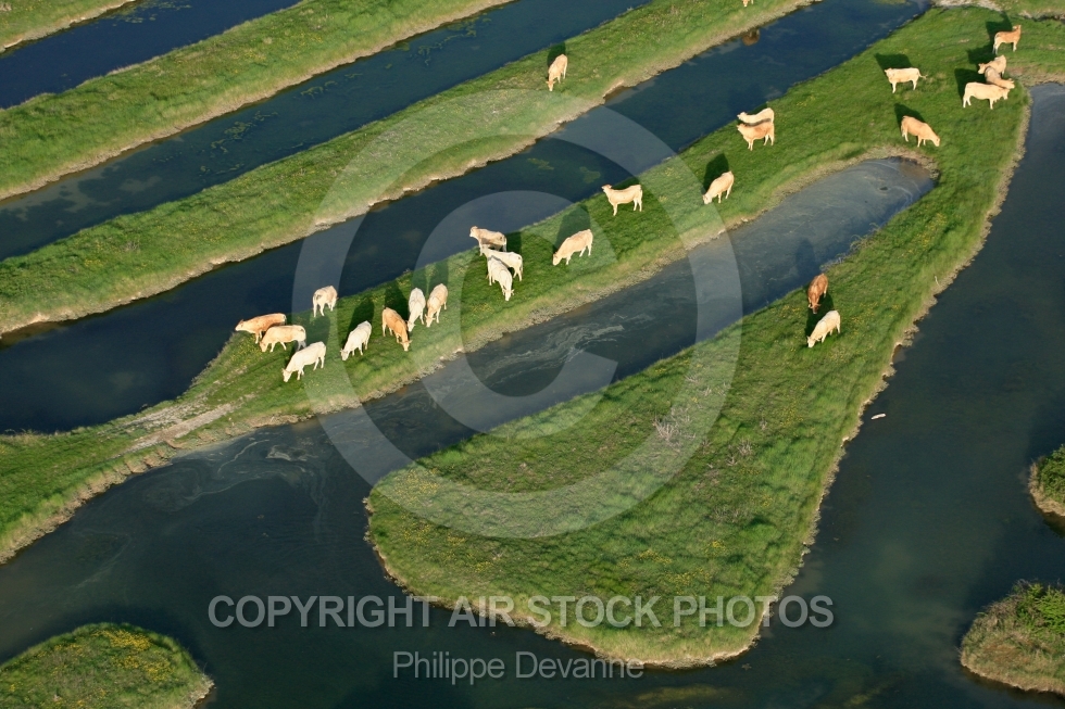 vue aerienne élevage bovins boeufs vaches campagne herbe troupeau marais bocage humide vendée poitevin jard-sur-mer côte atlantique verdure vert paysage 85 vendée pays-de-loire 85440 talmont-saint-hilaire