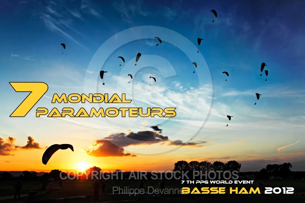 Description: Paramoteurs vus du sol au 7 eme mondial du paramoteur , le 22,23 et 24 juin 201 à57910 Basse-Ham, département de la Moselle, région Lorraine, France