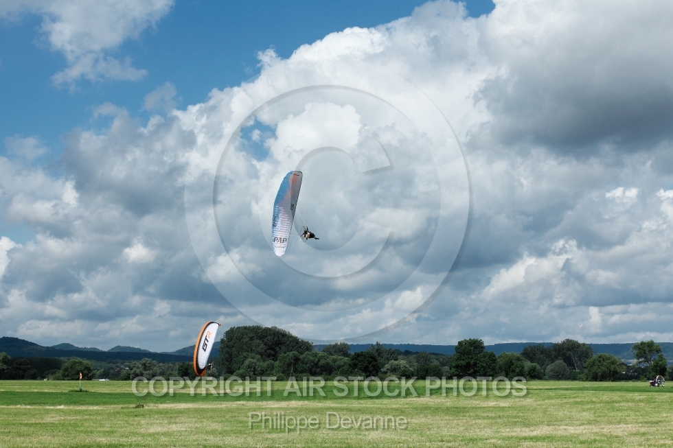 Description: Paramoteurs vus du sol au 7 eme mondial du paramoteur , le 22,23 et 24 juin 201 à57910 Basse-Ham, département de la Moselle, région Lorraine, France