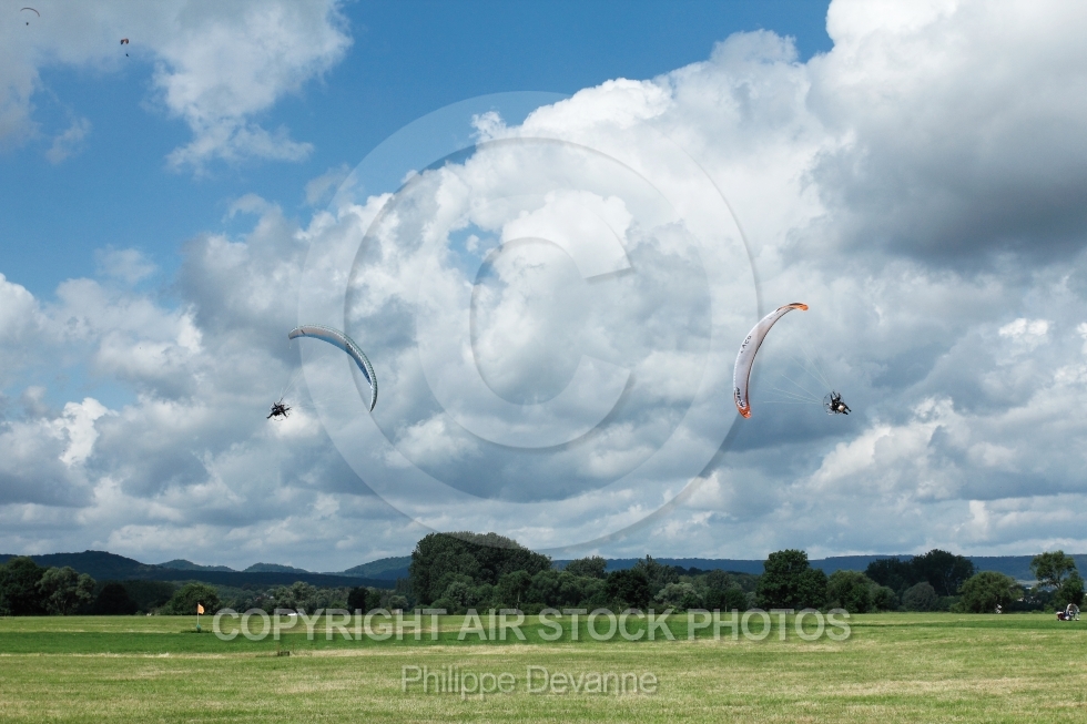 Description: Paramoteurs vus du sol au 7 eme mondial du paramoteur , le 22,23 et 24 juin 201 à57910 Basse-Ham, département de la Moselle, région Lorraine, France