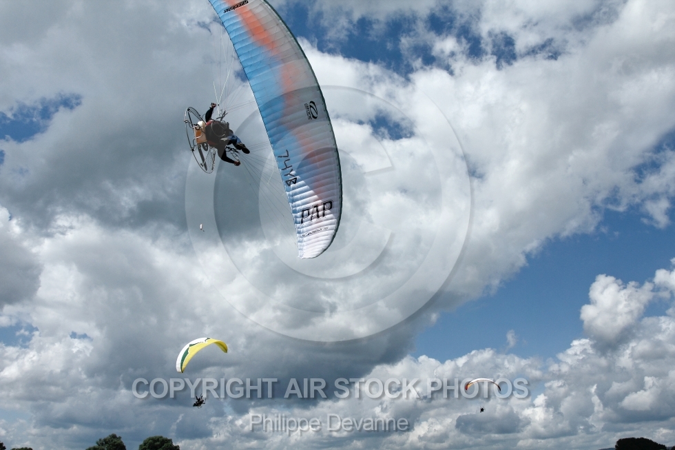 Description: Paramoteurs vus du sol au 7 eme mondial du paramoteur , le 22,23 et 24 juin 201 à57910 Basse-Ham, département de la Moselle, région Lorraine, France