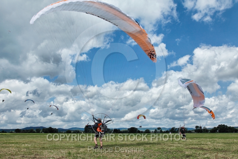 Description: Paramoteurs vus du sol au 7 eme mondial du paramoteur , le 22,23 et 24 juin 201 à57910 Basse-Ham, département de la Moselle, région Lorraine, France