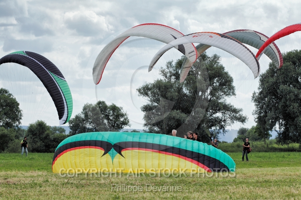 Description: Paramoteurs vus du sol au 7 eme mondial du paramoteur , le 22,23 et 24 juin 201 à57910 Basse-Ham, département de la Moselle, région Lorraine, France