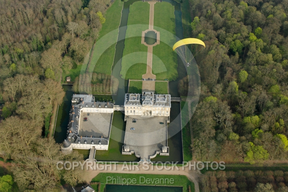 Description: Photo aérienne du château du Marais survolé par une voile paramoteur. Commune du Val-Saint-Germain 91530, Canton de Saint-Chéron, Essonne, France.