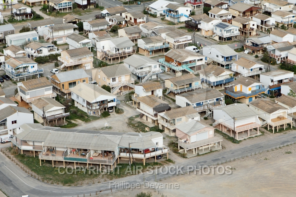 Description: Vue aérienne des chalets sur pilotis de Guissan plage 11430, Aude, Languedoc-Roussillon, France