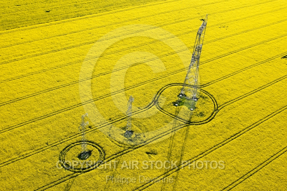Description: Photo aerienne pylone electrique dans les champs de colza en Essonne 91, France