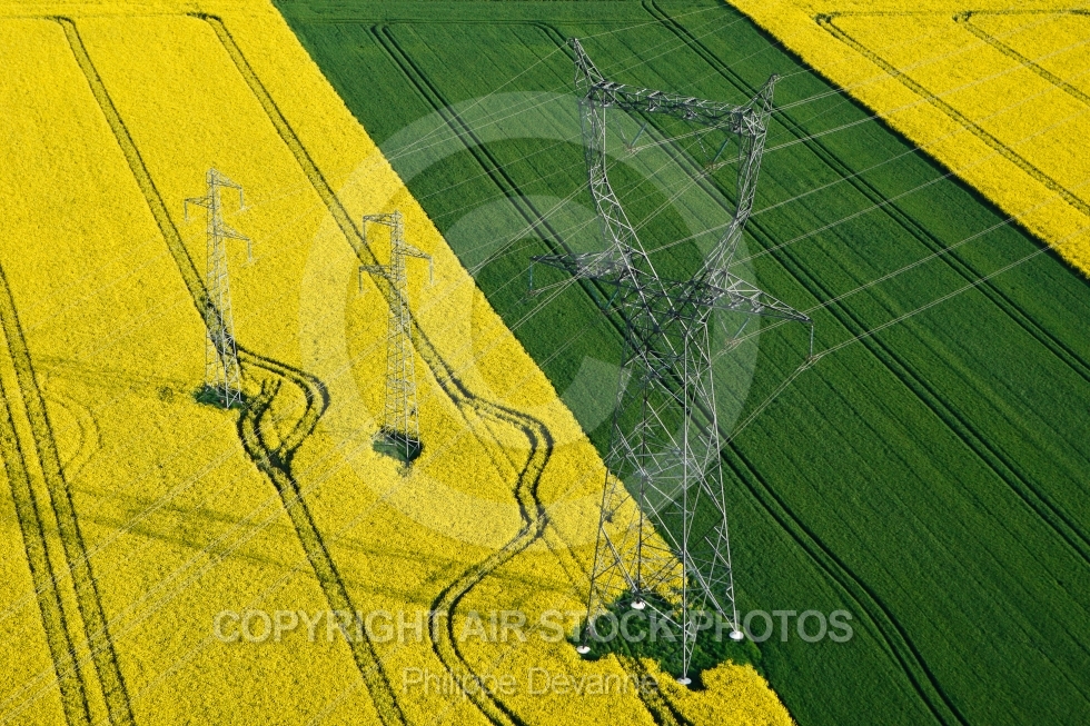 Description: Photo aerienne pylone electrique dans les champs de colza en Essonne 91, France