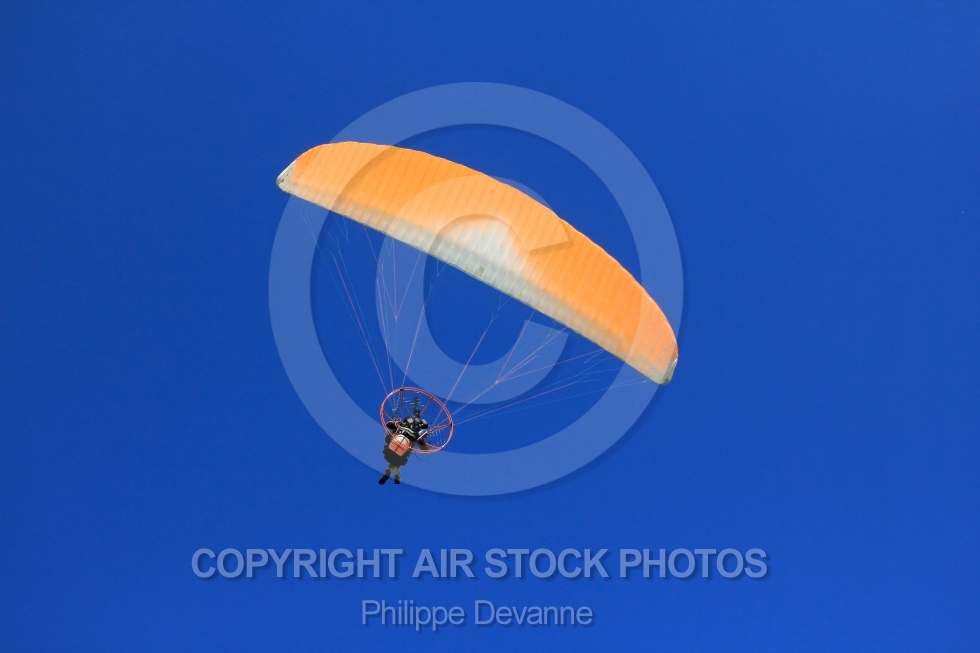 Description: pilote paramoteur parapente orange et ciel bleu en vol