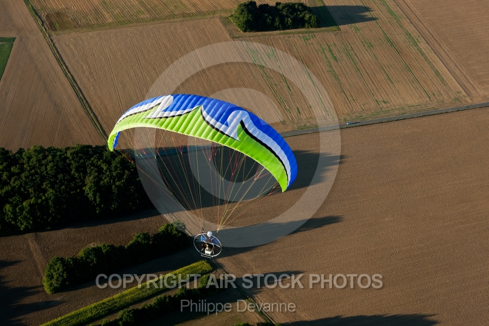 Description: voile paramoteur bleu et verte au dessus des champs de blé d Ile-de-France en septembre 2013