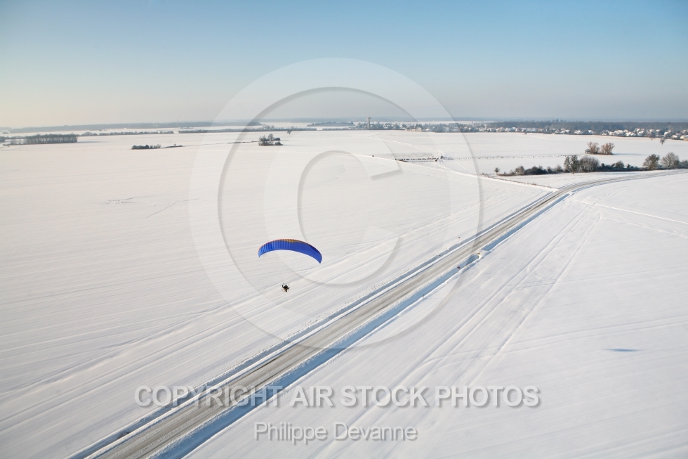 Description: Paramoteur photographié du ciel en hiver et suivant une route enneigée dans les champs d Ile-de-France