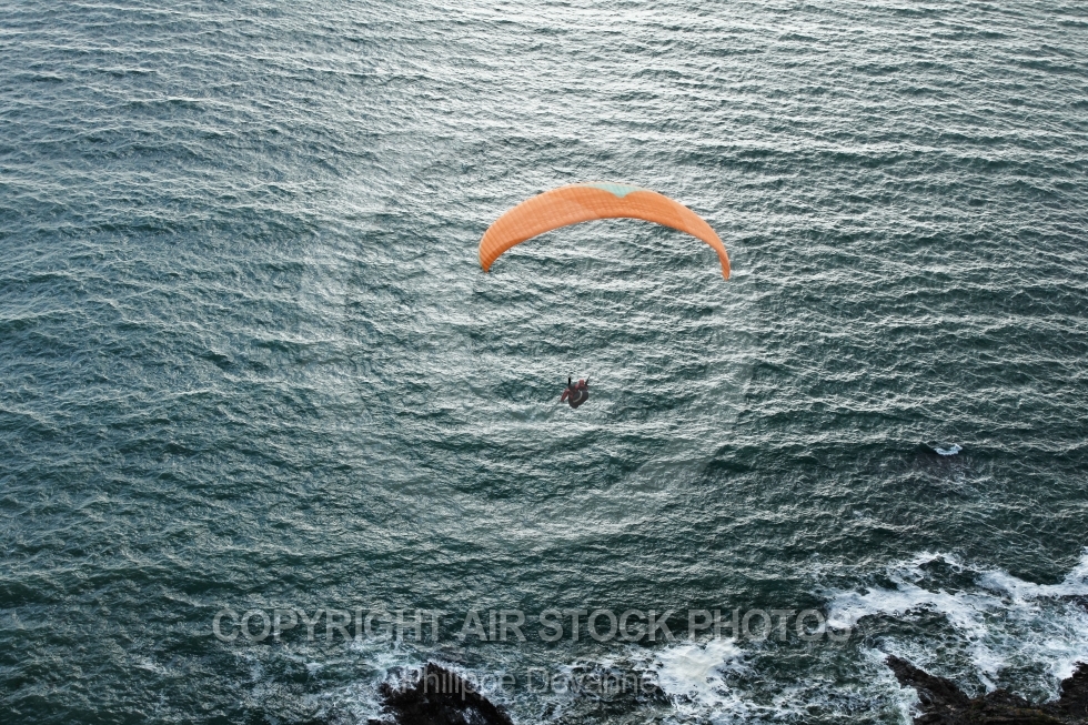 Photo aérienne d un parapente en vol soaring au dessus des falaises entre la Pointe de Trefeuntec et la Plage de Kervel , commune de Plonévez-Porzay, département du Finistère 29, La Bretagne vue du ciel, France Ouest, Europe