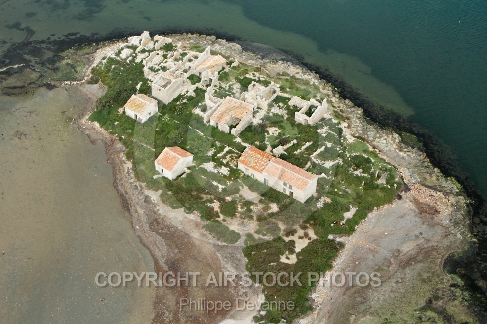 Description: Photo aérienne de l île de la Nadière sur l Etang de Bages Sigean , au sud de l île de Ste-Lucie, en plein coeur du parc naturel Narbonnais . Port-la-Nouvelle 11230, Aude, Languedoc-Roussillon, France