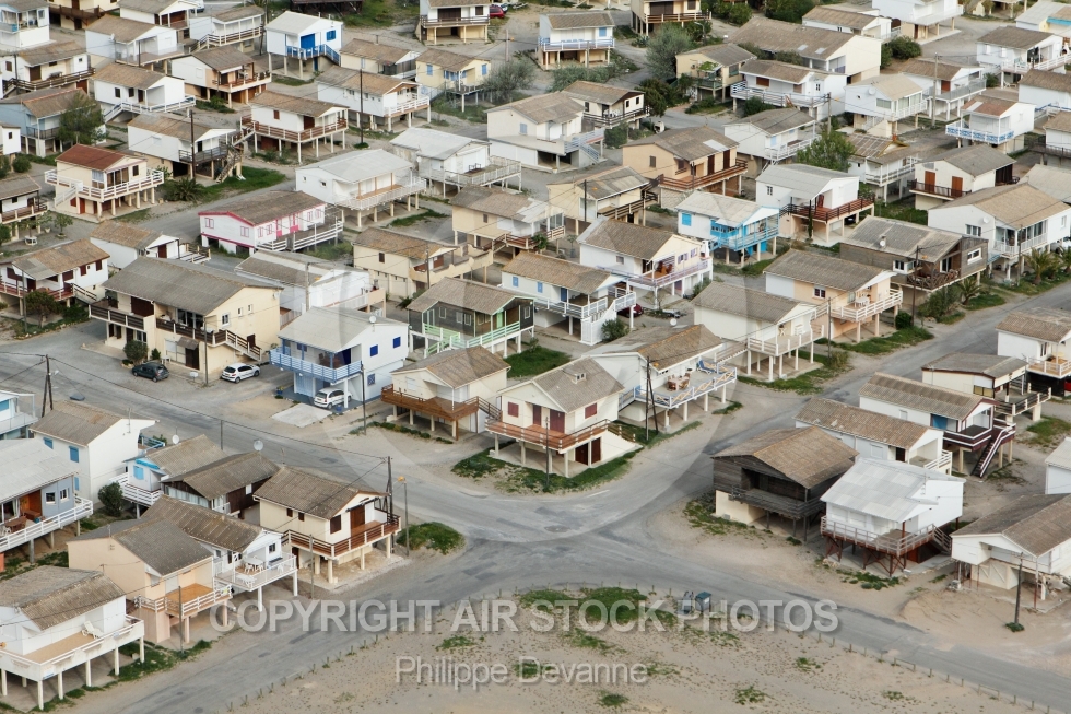 Description: Vue aérienne des chalets sur pilotis de Guissan plage 11430, Aude, Languedoc-Roussillon, France