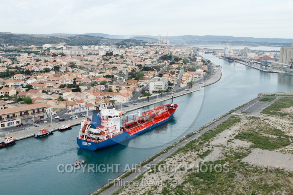 vue aérienne d un pétrolierchimiquier entrant dans le canal de Port-la-Nouvelle, 11210, Aude, Languedoc-Roussillon, France