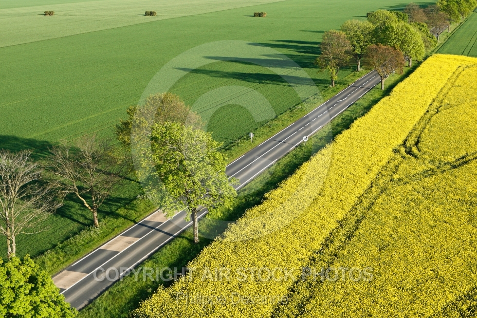 Description: photo aerienne d une route de printemps et colza en Eure-et-Loir 28